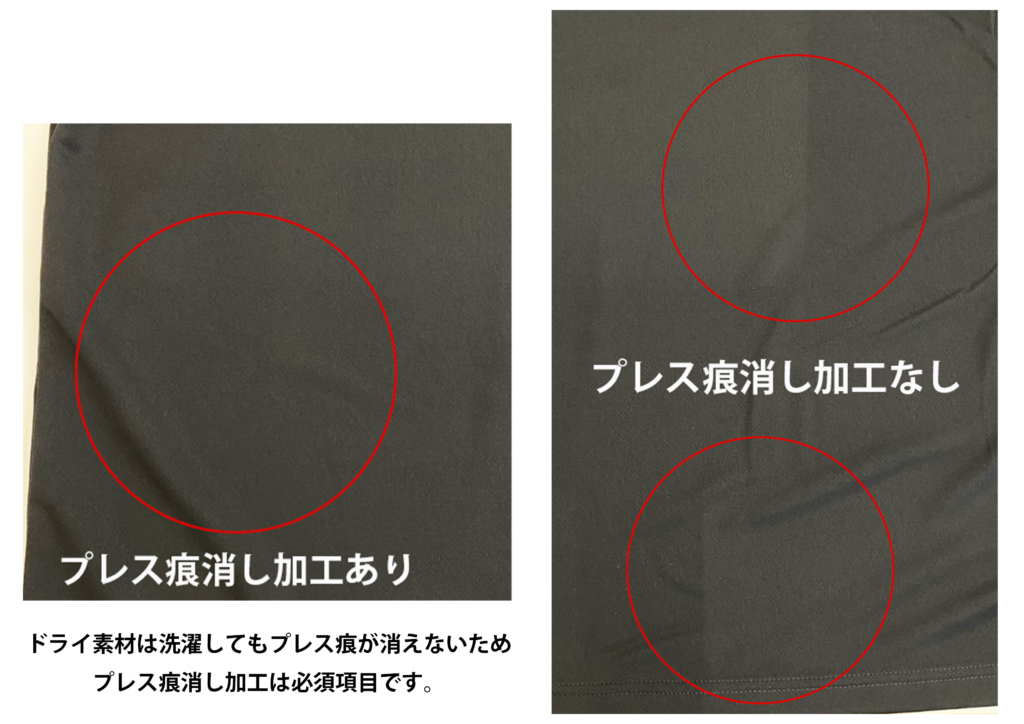 プレス痕とは、プリント加工などで高温のプレス機を使い生地に圧力をかけた際に生じる